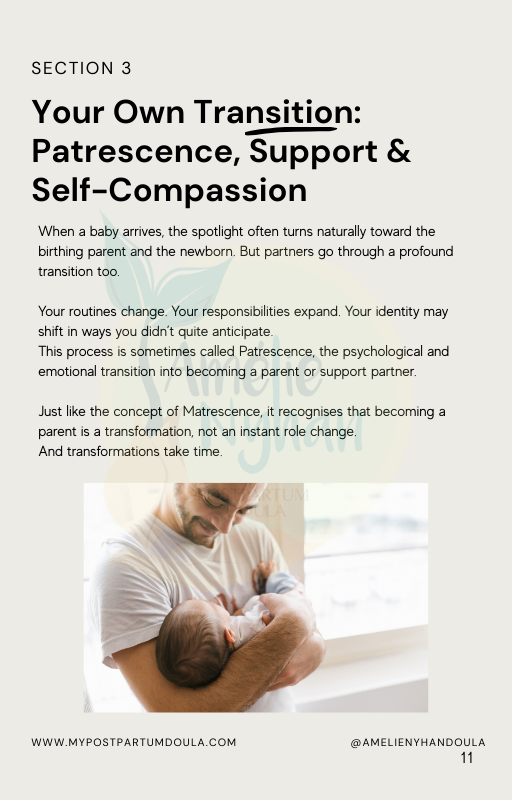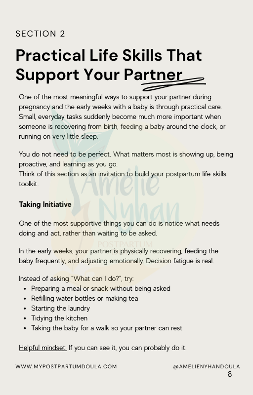 The Partner’s Guide was created by a postpartum doula to give partners a clear, realistic picture of what the first weeks can look like and the small everyday actions that make a big difference.